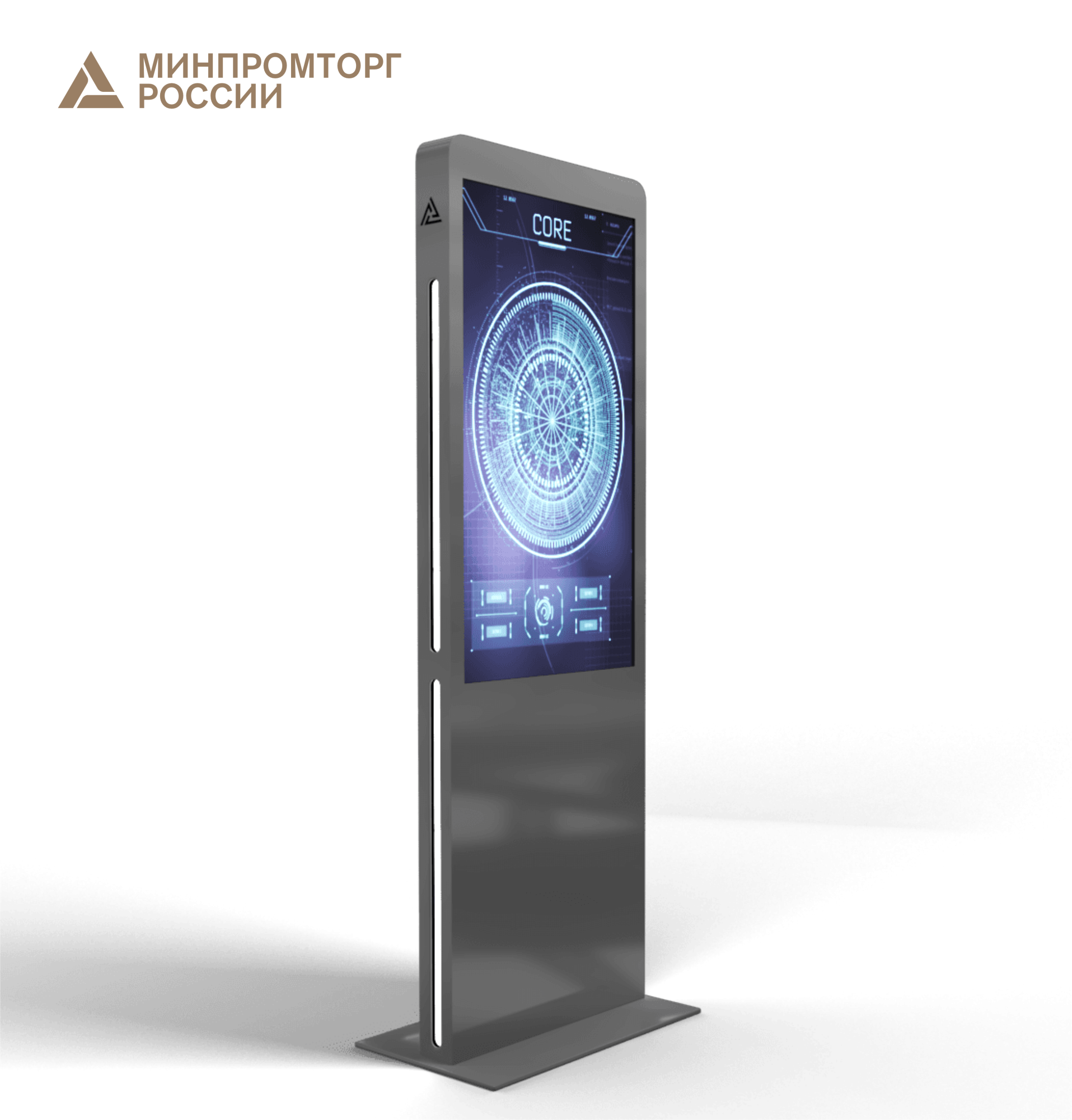 Интерактивный сенсорный киоск в классическом форм-факторе: стальной антивандальный корпус, стильный минималистичный дизайн, дисплей, ИК-рамка которого поддерживает до 10 одновременных касаний.