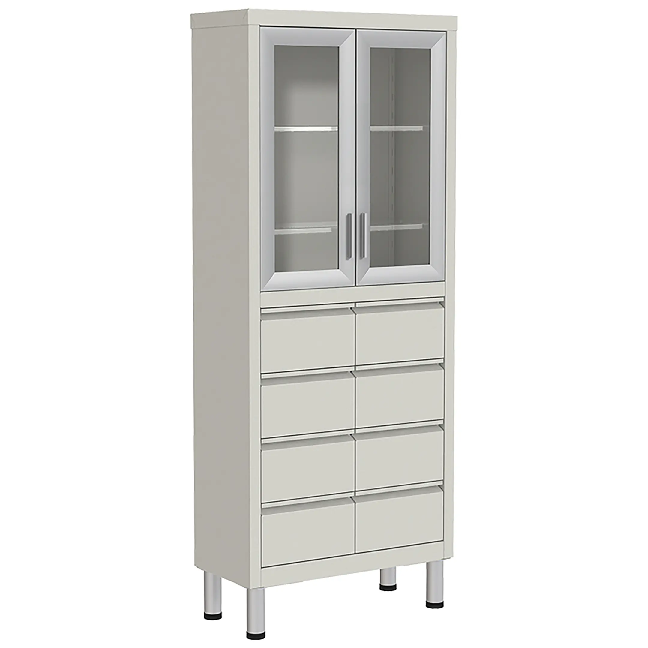 - верхняя секция имеет стеклянные двери в раме из алюминиевого профиля, укомплектованные магнитными защёлками и мебельными ручками. Оси двери вставляются в отверстия в горизонтальных коробах при сборке шкафа, а наличие втулок из ПВХ исключает люфт и смягчают работу двери. Две стеклянные полки устанавливаются на удобную для эксплуатации высоту;