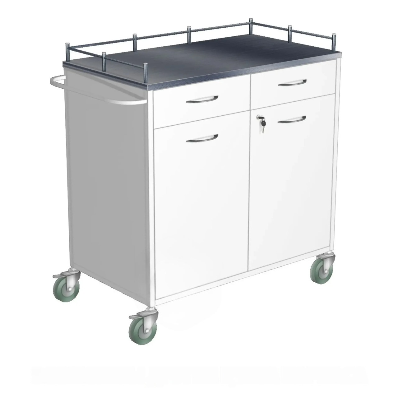 • Колеса: самоориентирующиеся Ø100 мм из немаркой серой резины, два колеса с тормозным устройством.