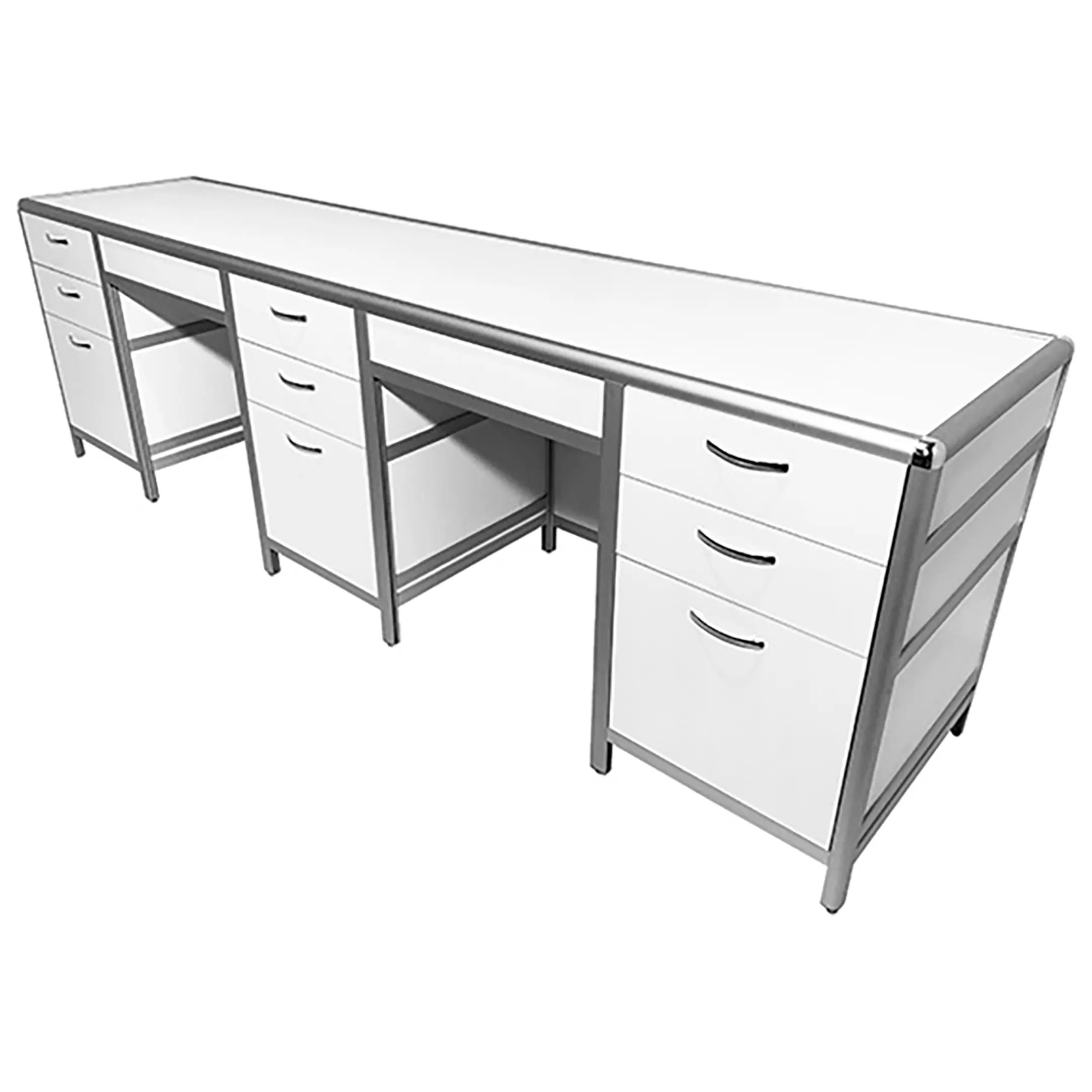 Стол лабораторный MED 10.013al (белый) — это идеальное решение для обустройства рабочего места сотрудников в лабораториях и медицинских учреждениях. Модель оснащена тремя тумбами, каждая с тремя выдвижными ящиками, обеспечивая обширное пространство для хранения. Каркас выполнен из алюминиевого профиля, столешница из ЛДСП толщиной 22 мм.
