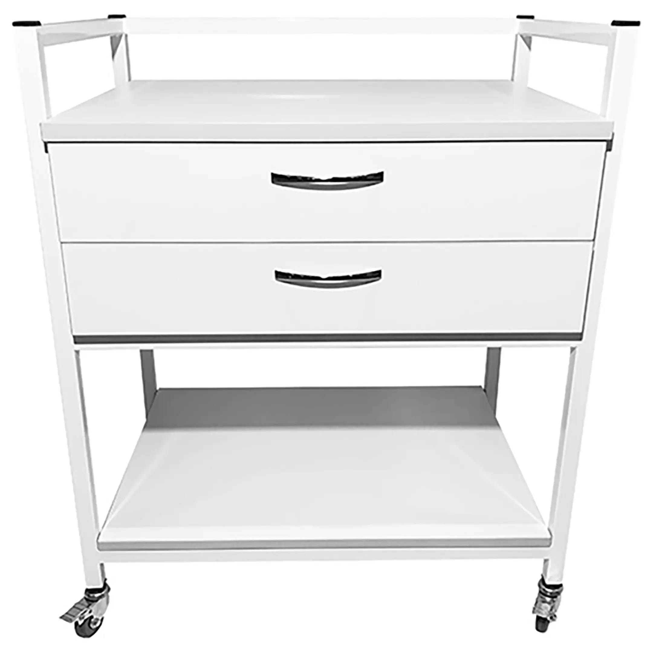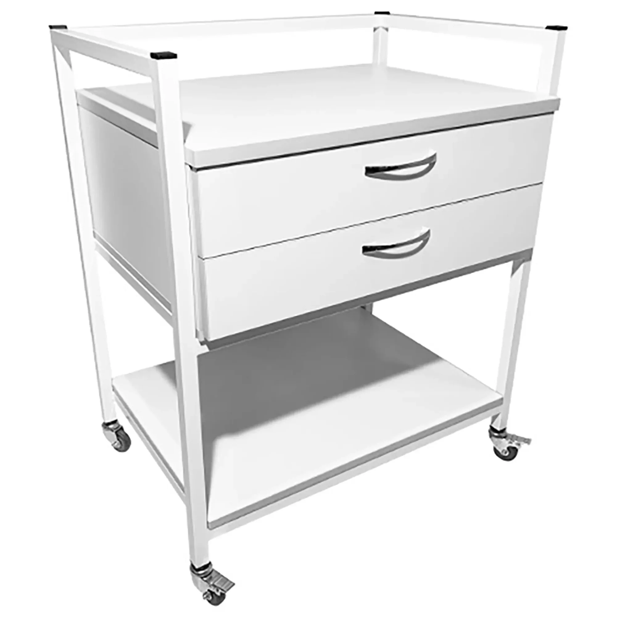 Стол лабораторный мобильный СЛм 17.002 (белый) — это идеальное решение для временного размещения и удобного перемещения различных инструментов, предметов и приборов в медицинских учреждениях и лабораториях. Модель оснащена двумя выдвижными ящиками и полкой под столешницей. Каркас выполнен из стального профиля, столешница из ЛДСП толщиной 16 мм.