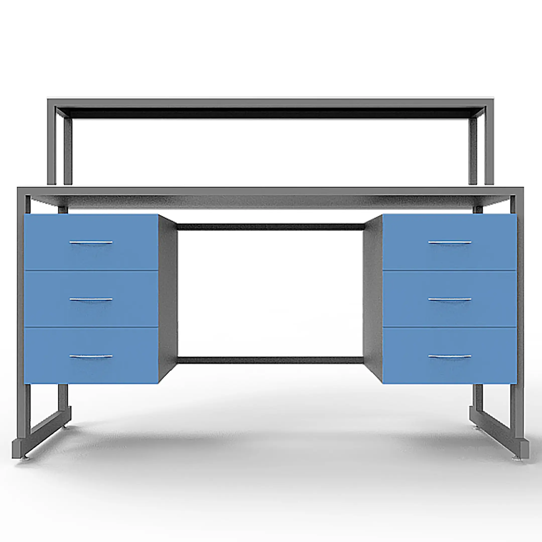 - Вместительная система хранения — две тумбы под столешницей, каждая с тремя выдвижными ящиками (всего 6 ящиков), и надстройка с полкой.