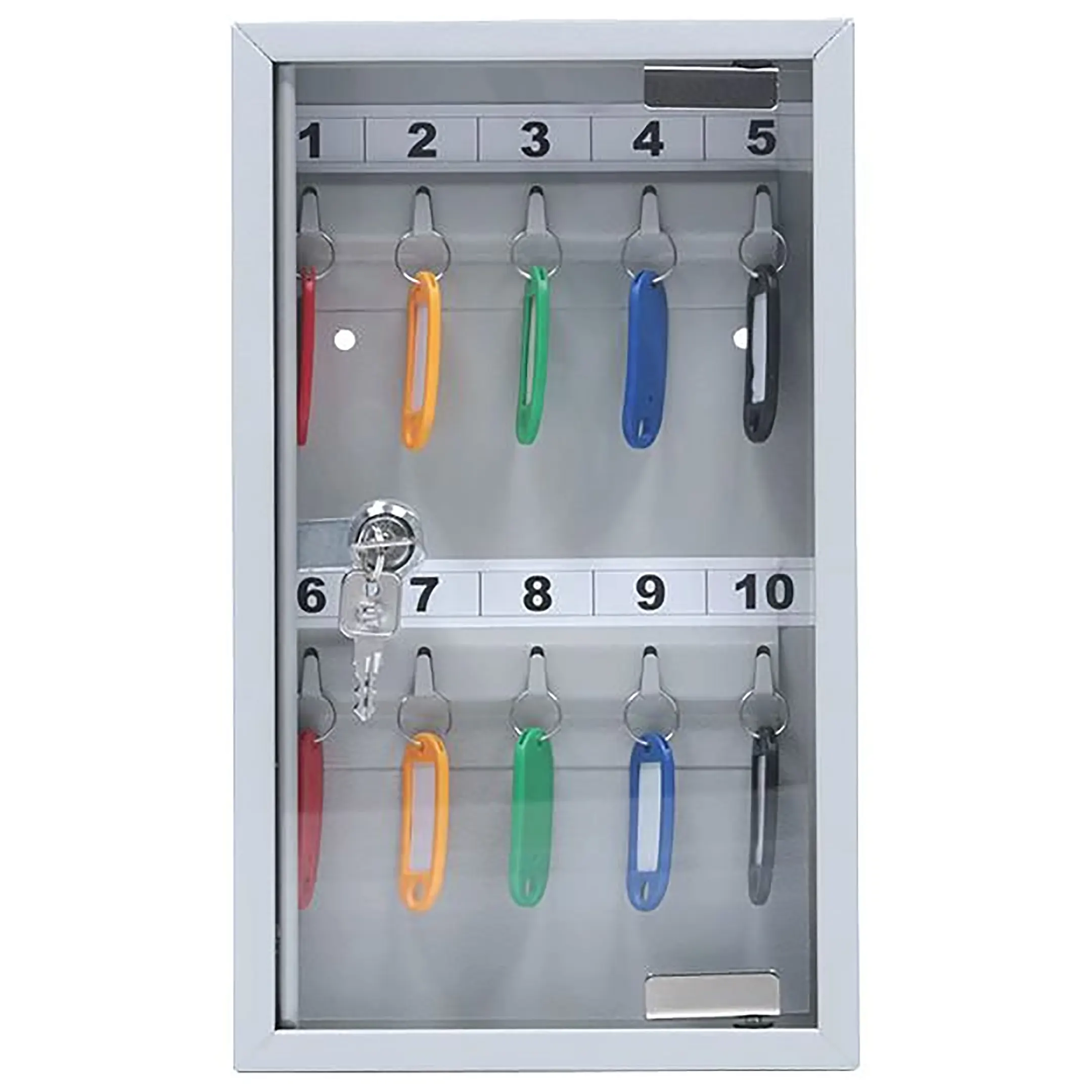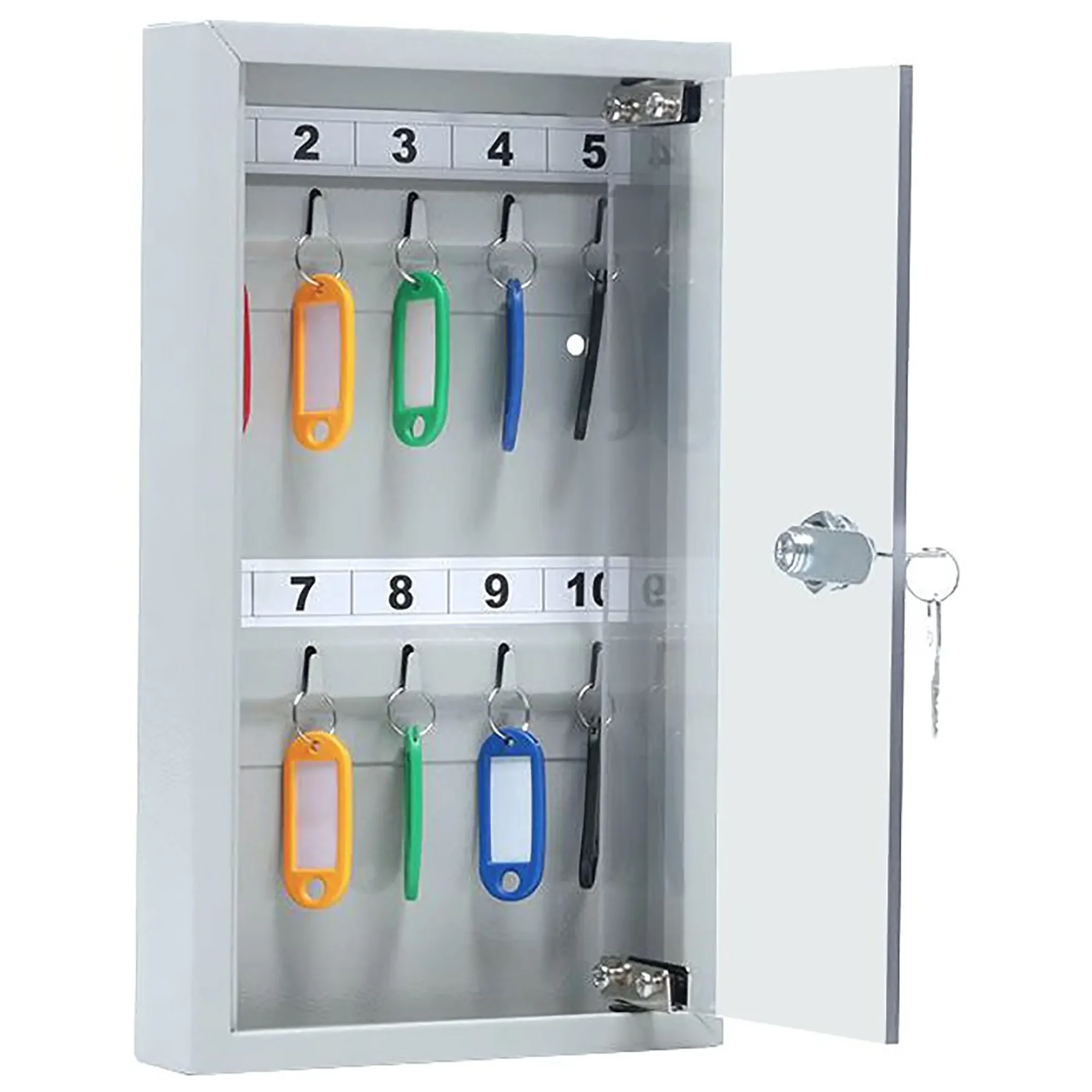 Ключница с прозрачной дверцей КЛС-10 (с брелками) — это компактная и наглядная система для организованного хранения ключей на небольших рабочих местах и в кабинетах. Конструкция со стеклянной дверцей и полным комплектом брелков обеспечивает удобный визуальный контроль, быстрый поиск и аккуратное хранение для 10 комплектов ключей.
