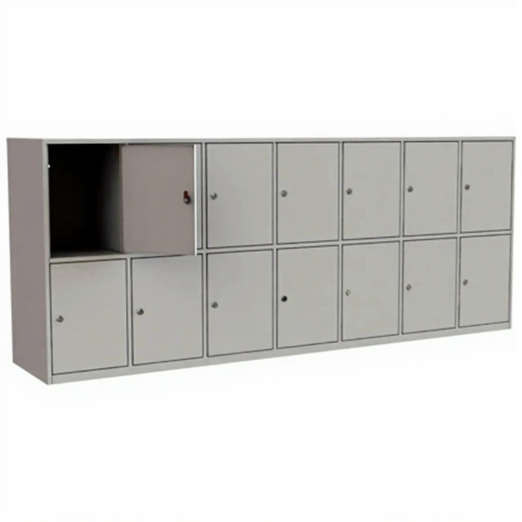 - Индивидуальные ячейки с замками — каждая из 14 секций имеет отдельную дверцу, обеспечивающую персональное хранение и защиту содержимого.