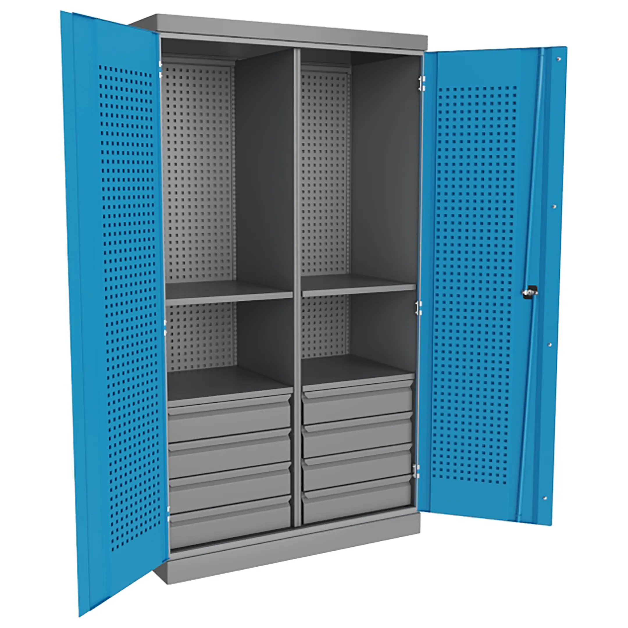 - Продуманная система организации пространства — шкаф оснащен четырьмя вместительными выдвижными ящиками разной высоты для сортировки инструмента по типу и размеру, а также внутренним отделением за распашной дверцей для хранения крупногабаритного оборудования или расходных материалов.