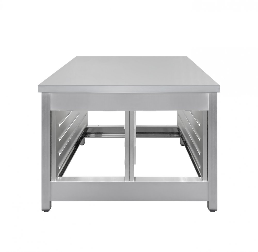 Подставка изготовлена из нержавеющей стали, устойчивой к перепадам температуры и высокой влажности. Кромки корпуса с подгибом гарантируют безопасность сотрудников при сборке, эксплуатации и санитарной обработке подставки.