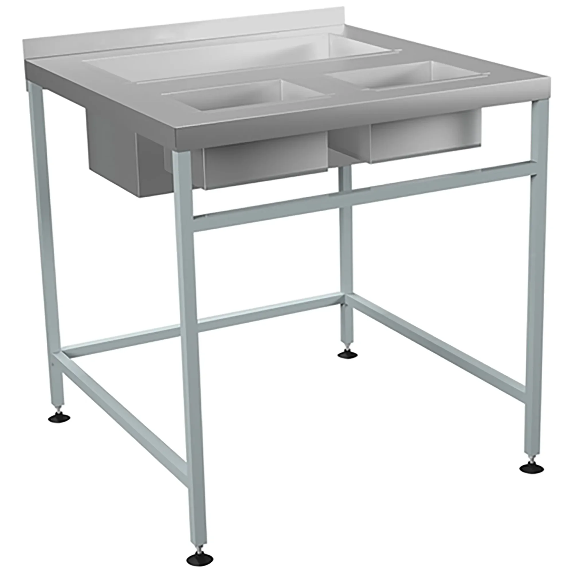 • Стол имеет 1 герметичную съёмную ванну размером 635х295х250 и два прямоугольных отверстия с патрубками размером 270х190х150 для сбора отходов.