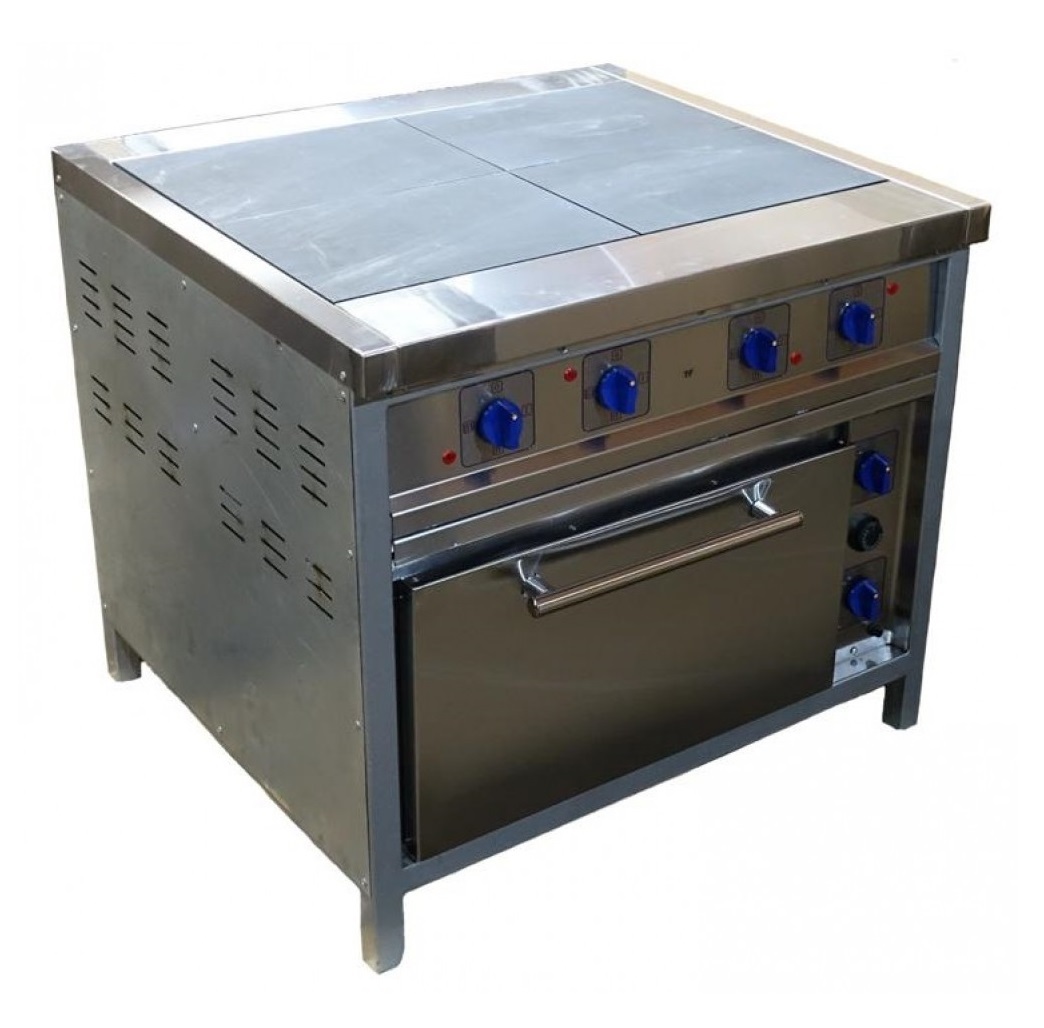 Электрическая четырехконфорочная плита с жарочным шкафом. Предназначена для приготовления различных блюд в наплитной посуде, противнях и решетках на предприятиях общественного питания и торговли. Модель оснащена энергосберегающими конфорками, ступенчатым регулированием температуры и регулируемыми по высоте ножками.