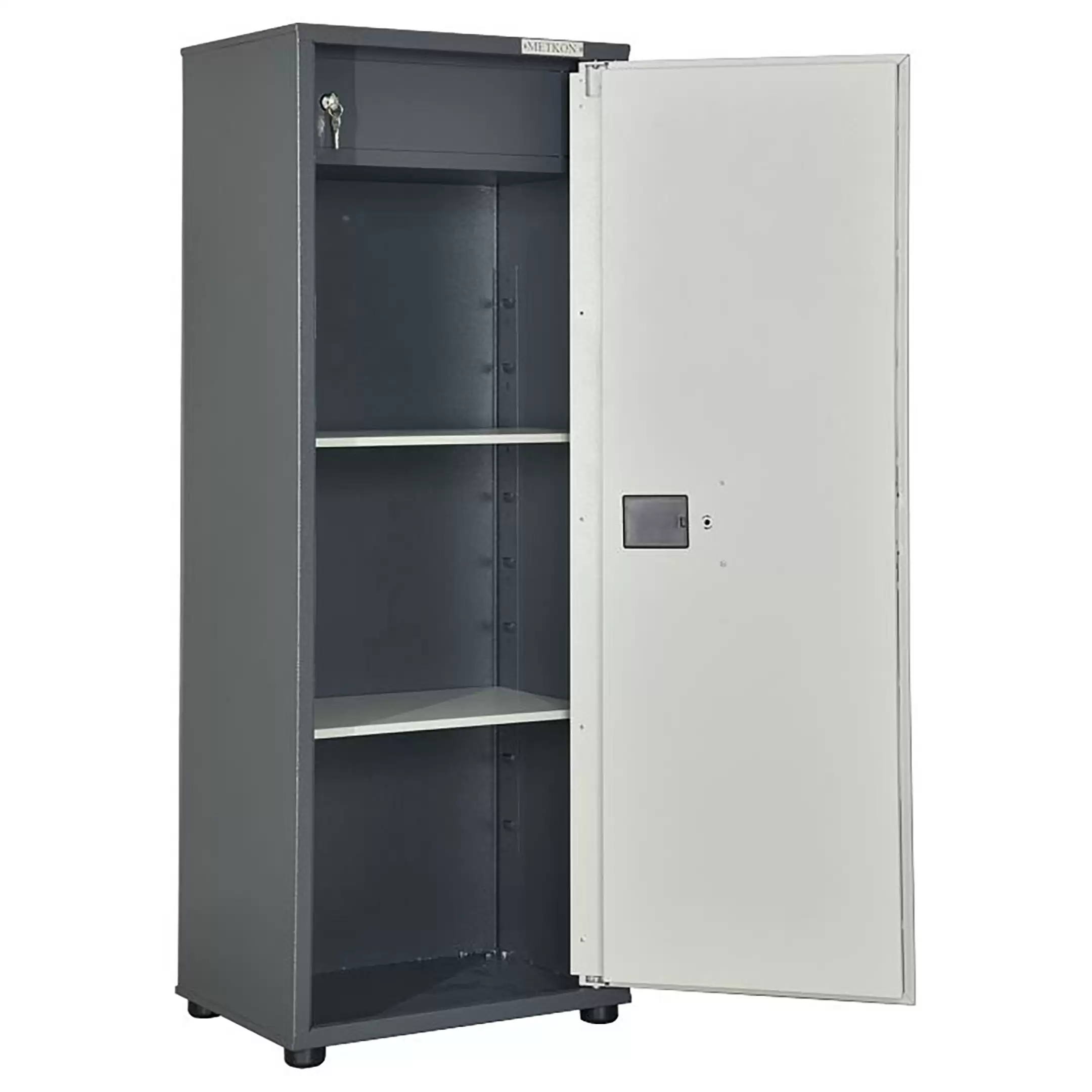 - Современная система электронной защиты — шкаф оснащен электронными замками на обеих створках, что обеспечивает повышенный уровень безопасности хранения конфиденциальных документов и ценных предметов. Управление доступом осуществляется с помощью кода или карты, исключая риск утери механических ключей.