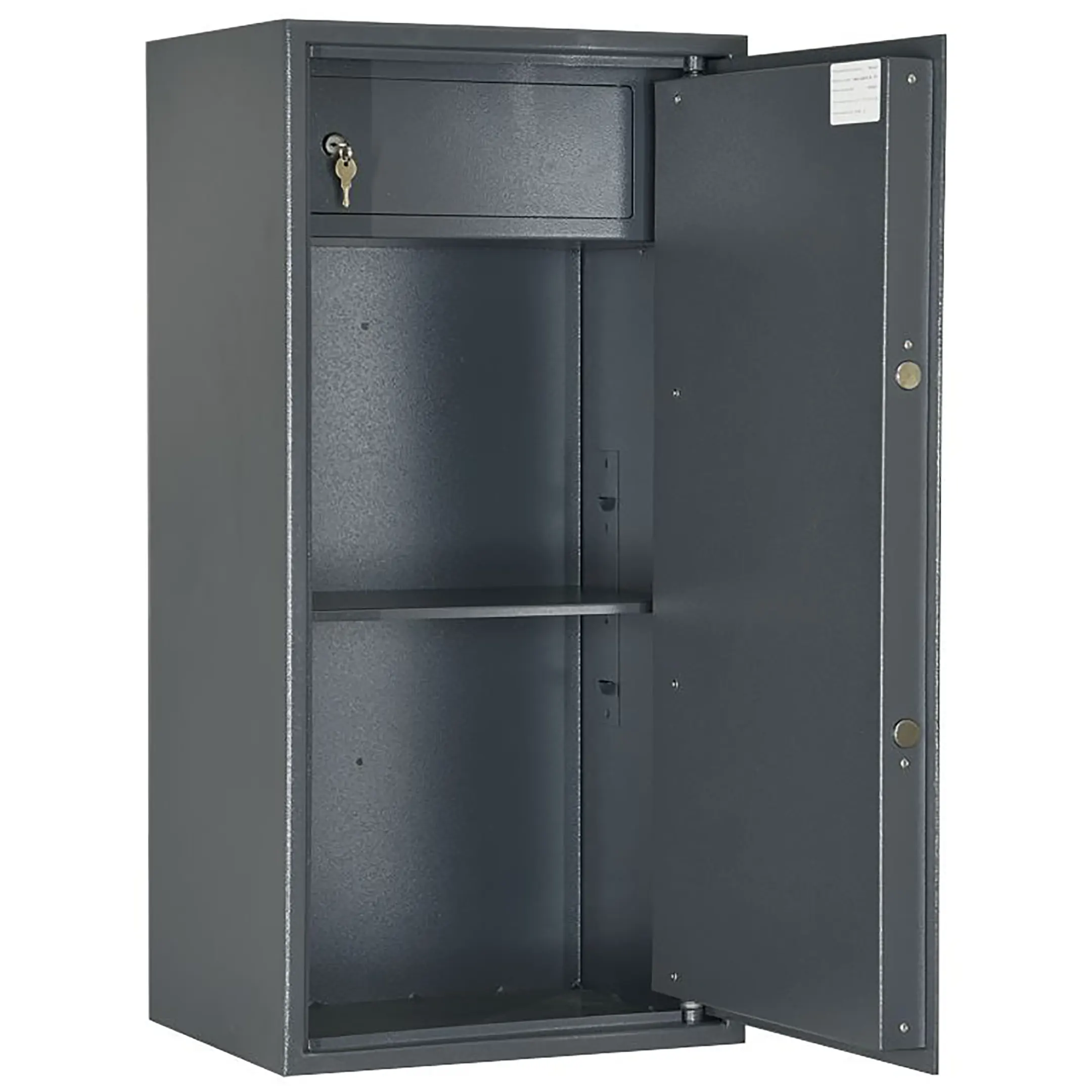 - Сейф двухсекционный, оснащен двумя съемными полками и трейзером.