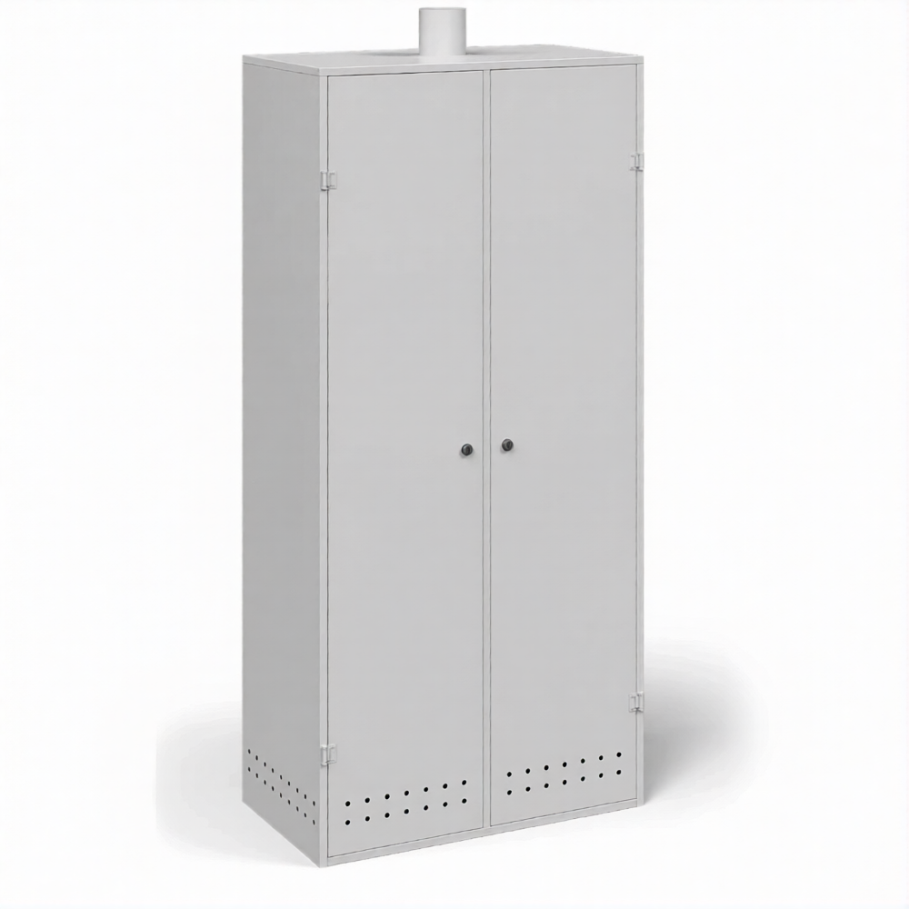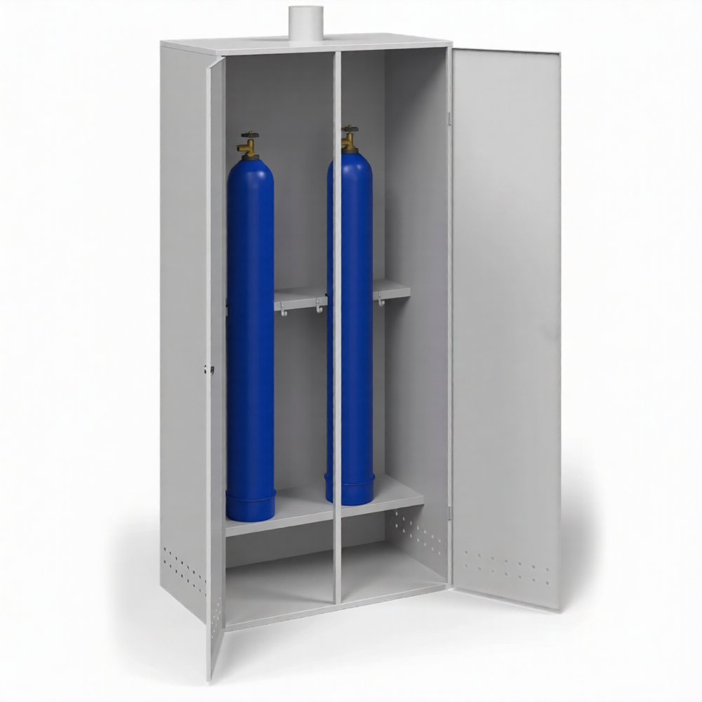 - Обеспечение требований пожарной и промышленной безопасности — прочный усиленный металлический корпус надежно изолирует баллоны и оборудование от внешних источников возгорания. Система вентиляции обеспечивает необходимый воздухообмен для отвода возможных утечек газа. Хранение редукторов и шлангов в закрытом шкафу защищает их от попадания масел, жиров и грязи, что особенно важно для кислородного оборудования и является требованием правил безопасности.