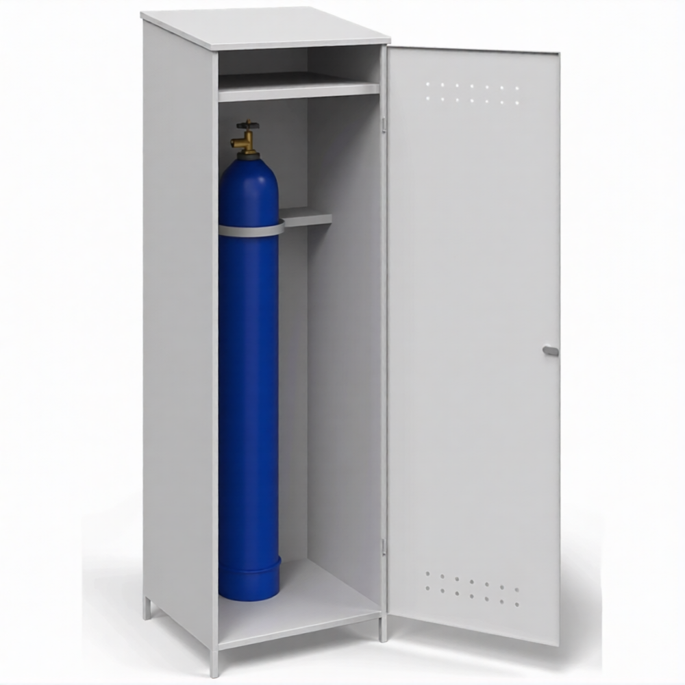 - Специализированная конструкция для одиночного баллона большой емкости — шкаф разработан с учетом габаритов, веса и центра тяжести стандартного 40-литрового баллона. Его внутреннее пространство и система фиксации обеспечивают максимально безопасное и устойчивое вертикальное хранение, что идеально для постов с одним видом газа (например, пропан для отопления, азот для продувки, кислород для резки).