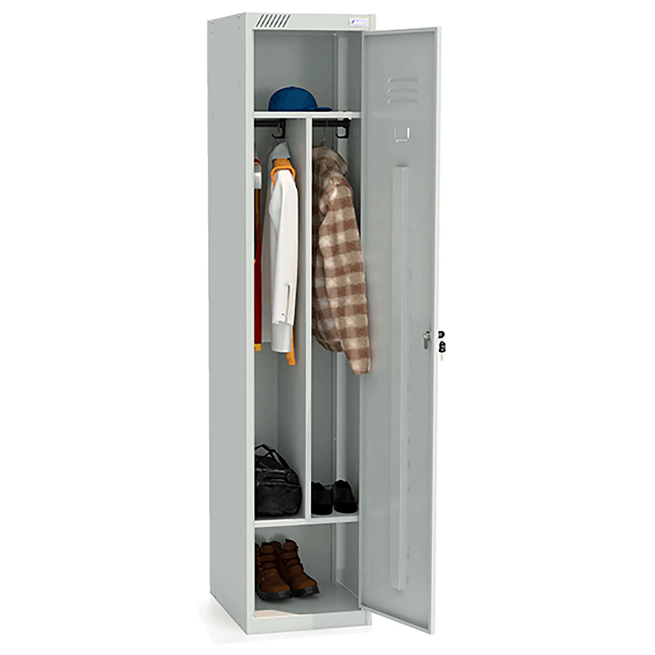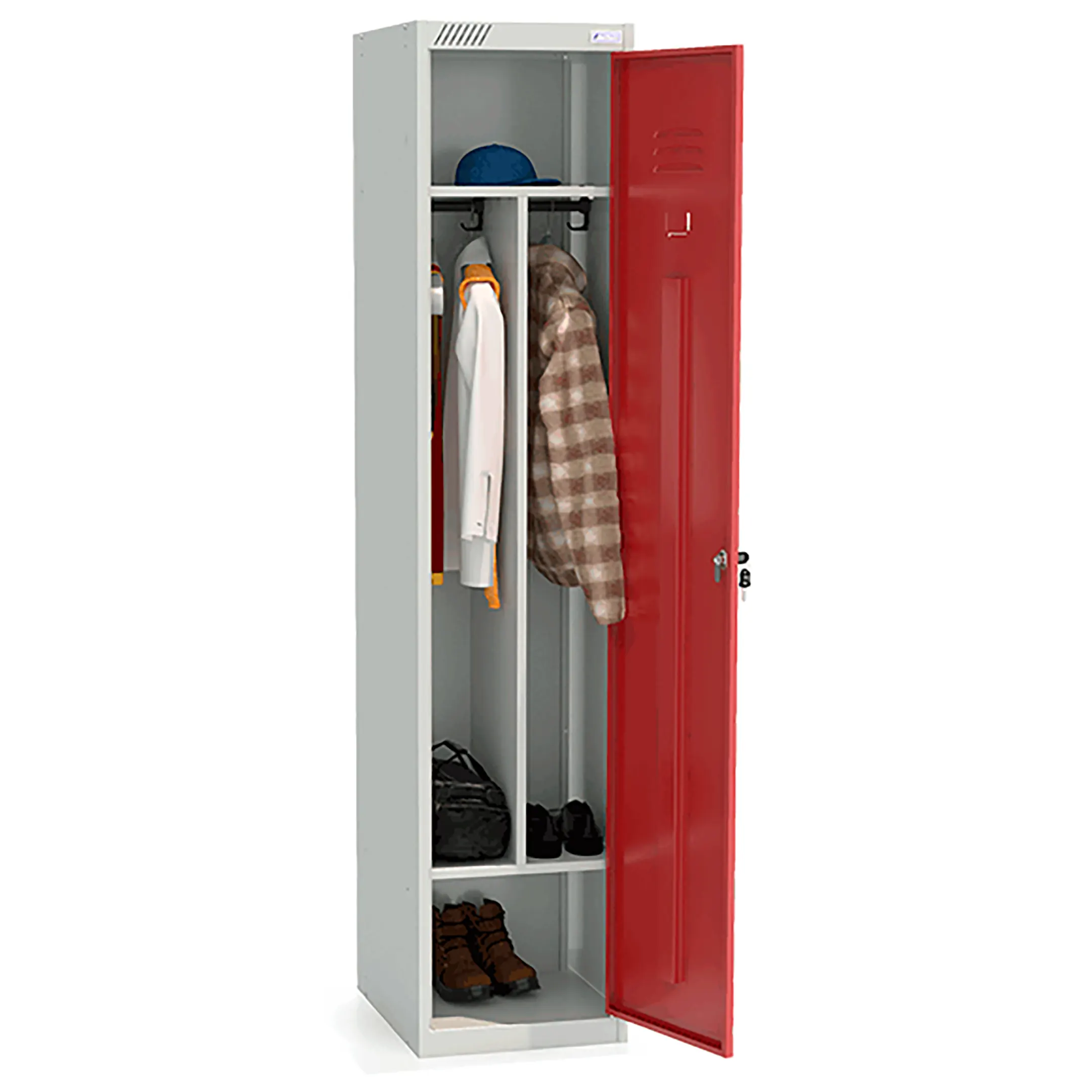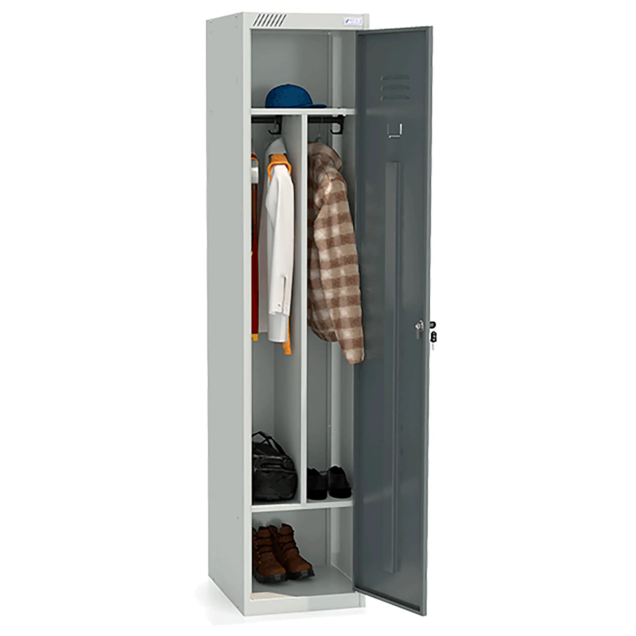 • комплектуется вертикальной перегородкой, общей полкой для головных уборов, полкой для обуви, 4 крючками, 2 перекладинами, 1 замком повышенной секретности;