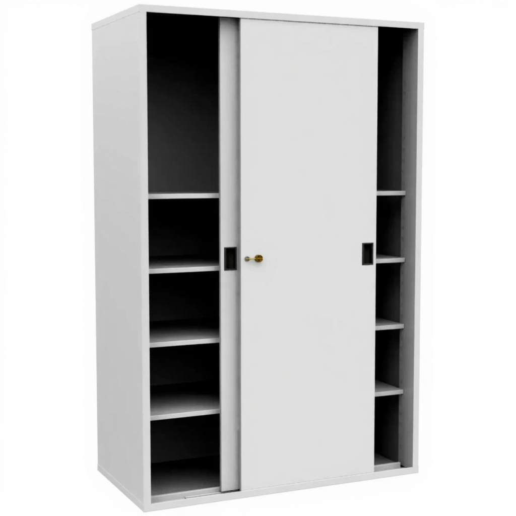 - Экономия рабочего пространства — раздвижные двери не требуют дополнительного места для открывания, в отличие от распашных. Это позволяет устанавливать шкаф вплотную к стене или другой мебели, максимально эффективно используя площадь кабинета, архивохранилища или коридора.