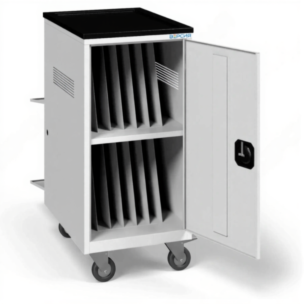 - Надежная защита и мобильность — прочная металлическая конструкция с запирающимися дверцами защищает технику от кражи и повреждений. Колеса позволяют легко перемещать тележку между кабинетами или помещениями.